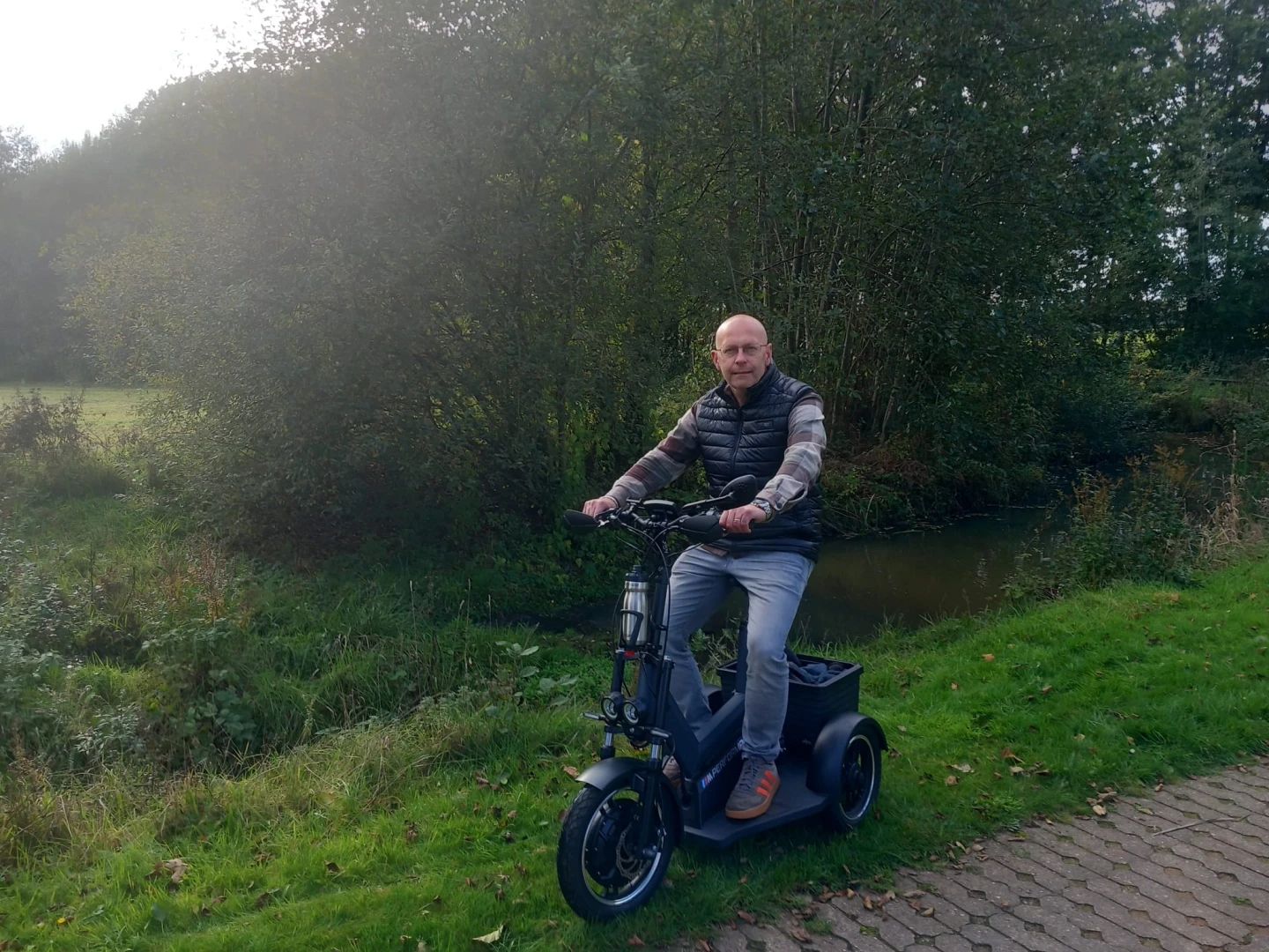 “En ja,” lacht hij, “ik zet hem buiten altijd stevig op slot. Hij valt natuurlijk op — mensen draaien zich om, stellen vragen. En ik vertel er graag over. Want dit is geen hulpmiddel, dit is vrijheid.”